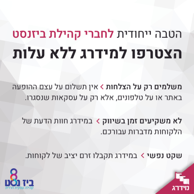 במיוחד לחברים בקהילת העסקים של ביזנסט – בדיקת התאמה למידרג ללא עלות. הצטרפות לאתר מותנית בבדיקה ראשונית, ורלוונטית לעסקים עצמאים בתחומים המדורגים באתר. ההטבה בתוקף עד 9.3.23, ט"ז באדר.